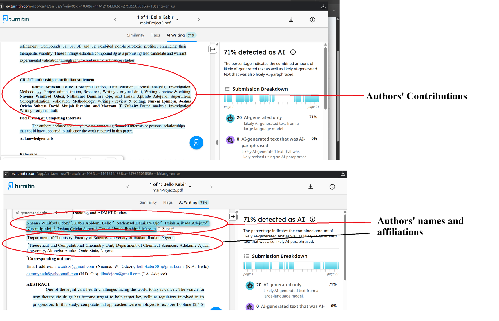 One of my students submitted his manuscript for check and I was surprised to see that Turnitin flagged the authors' names, affiliations and contributions as AI generated.