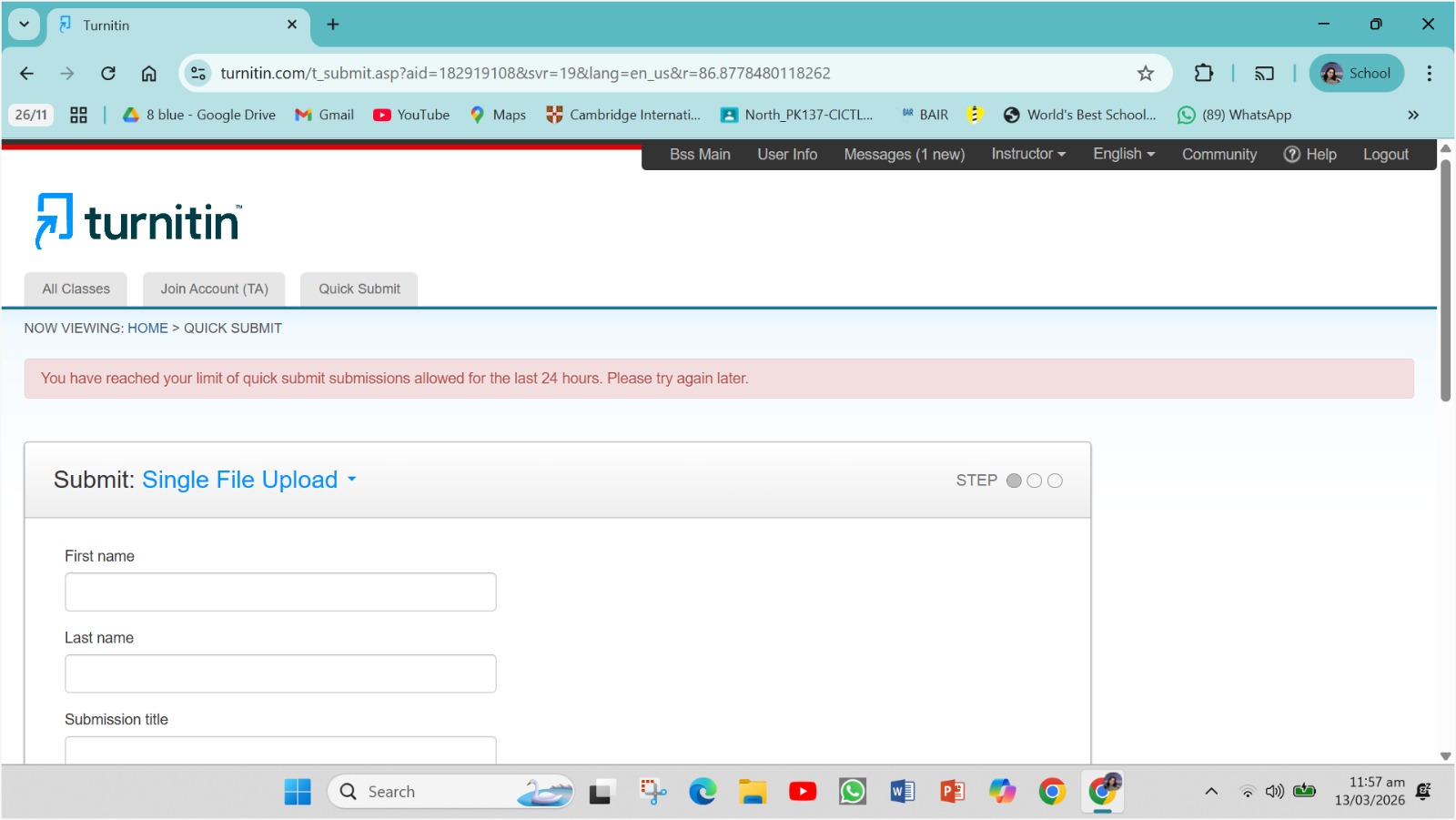 Effective December 18: To help keep Quick Submit reliable for checking one-off papers, the submission limit will be reduced from 100 to 25 submissions per instructor within a 24-hour period.